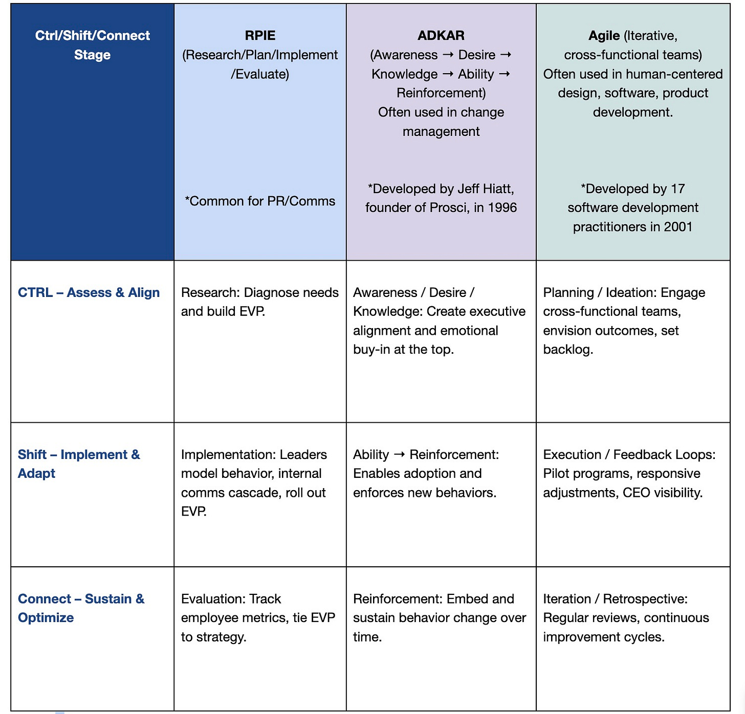 Each component of Ctrl/Shift/Connect is designed to integrate smoothly with methods already used across HR, project management, and transformation teams, making it easy for you to scale. Below, you’ll see how the Ctrl/Shift/Connect stages align with common models like Agile, ADKAR, and RPIE, so you know exactly how to stay in the driver’s seat as the primary sponsor.