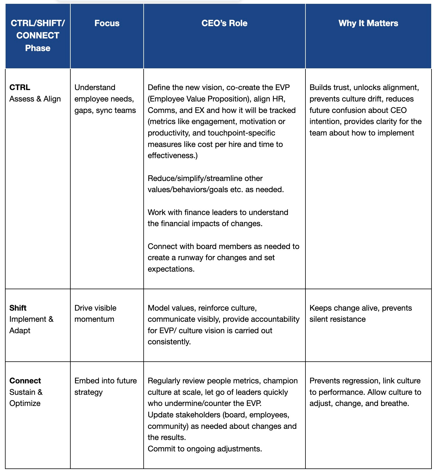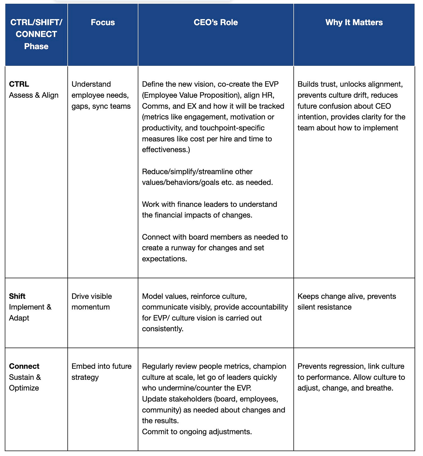 In an era defined by disruption, trust erosion, and AI-fueled acceleration, leadership can no longer rely on old playbooks. Ctrl/Shift/Connect is a flexible framework to help CEOs lead cultural transformation with clarity, without micromanaging execution.